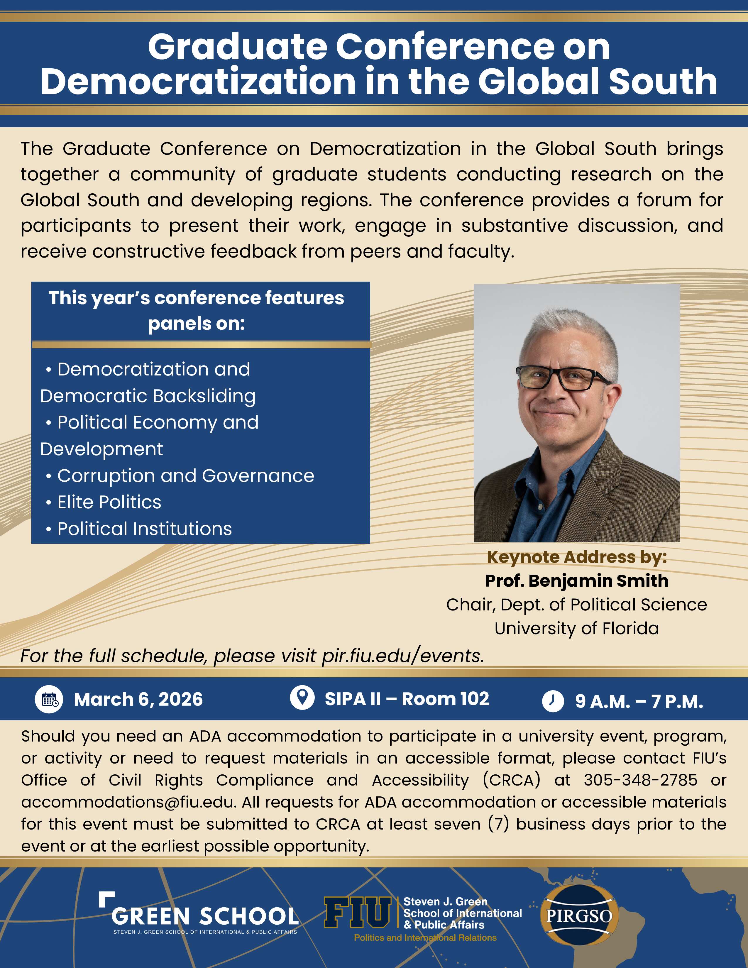 Should you need an ADA accommodation to participate in a university event, program, or activity or need to request materials in an accessible format, please contact FIU’s Office of Civil Rights Compliance and Accessibility (CRCA) at 305-348-2785 or accommodations@fiu.edu. All requests for ADA accommodation or accessible materials for this event must be submitted to CRCA at least seven (7) business days prior to the event or at the earliest possible opportunity.